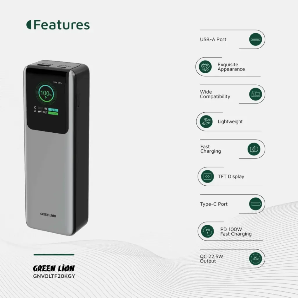 پاوربانک Green Lion Voltura 20000mAh با طراحی مقاوم، نمایشگر دقیق TFT، توان خروجی فوقالعاده ۱۰۰ وات و پشتیبانی از شارژ سریع PD و QC، یکی از قدرتمندترین گزینهها برای کاربران حرفهای، مسافران و افرادی است که به سرعت، ایمنی و دوام بالا اهمیت میدهند.